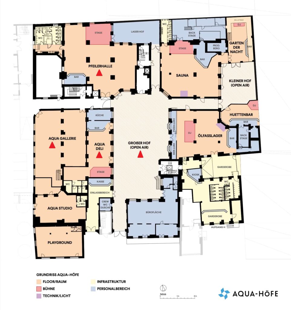 Die Ausstattung kombiniert historischen Industriecharme mit modernem Flair: Große Hallen und Galerien mit flexiblen Bestuhlungsoptionen, Bühnen in der Aqua Galerie und Pfeilerhalle sowie ein großzügiger Open-Air-Hof sorgen für eine vielseitige Nutzung. Indoor- und Outdoor-Flächen lassen sich kombinieren, um jedem Event die passende Atmosphäre zu verleihen.